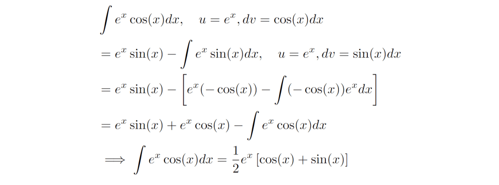 A common integral for first learning integration by parts is one involving an exponential – cosine product. Because the cosine function repeats itself after two derivatives (or integrations), we need to apply integration by parts twice to solve the problem. Here is the process.