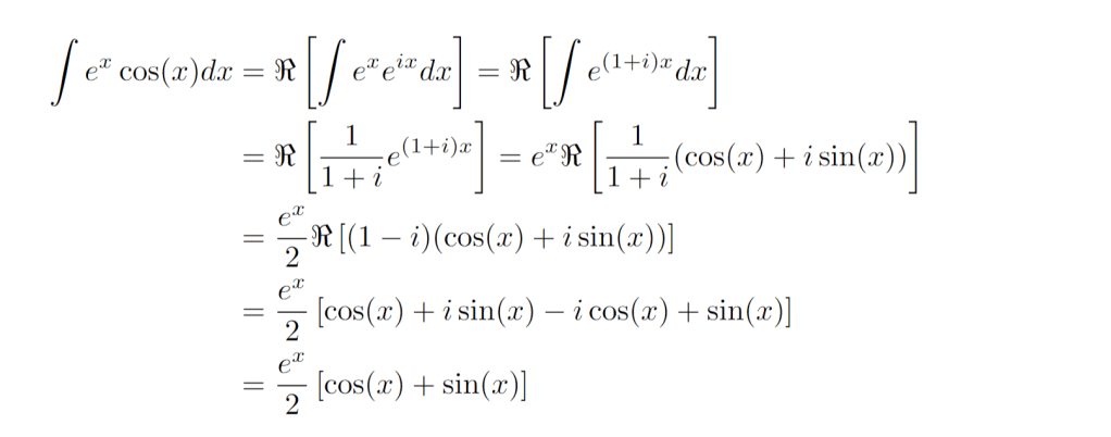 We can substitute these formulas in for sine and cosine, and then apply the integration rule for the exponential function. For our problem above, which involves only cosine, it is arguably easier to just take the real part of the integral. Real and imaginary parts may be denoted as follows.