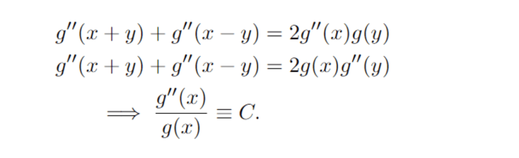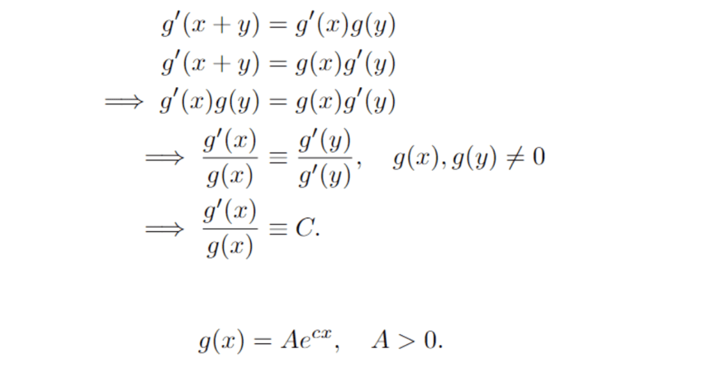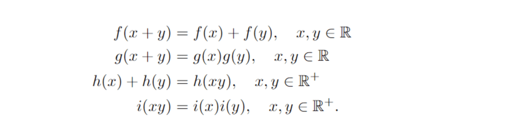 Let’s start with Cauchy’s first equation. The idea is to take partial derivatives as needed, in order to form a system of equations in which the terms involving non-trivial arguments can be eliminated.